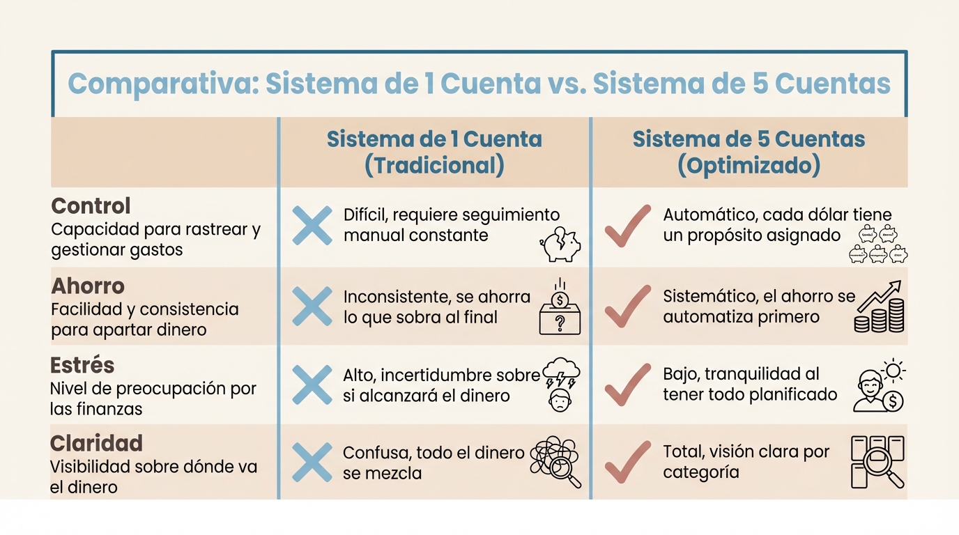 La ventaja principal es que no necesitas disciplina. Los sobres requieren que cada semana repitas el proceso manualmente. Las cuentas automáticas lo hacen solas. Configuras una vez y el sistema trabaja para ti. Sin fuerza de voluntad, sin decisiones diarias, sin olvidarte.
