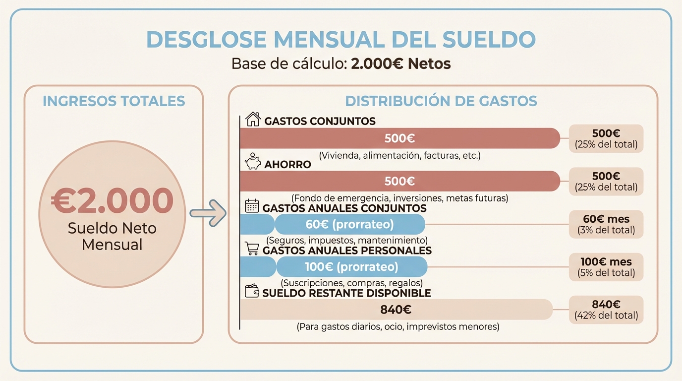 ¿Y si los sueldos son diferentes? Fácil: en vez de cantidades fijas, usáis porcentajes. Si uno gana 2.000 y otro 1.500, ambos aportan el mismo porcentaje de su sueldo a las cuentas conjuntas. Justo y transparente.