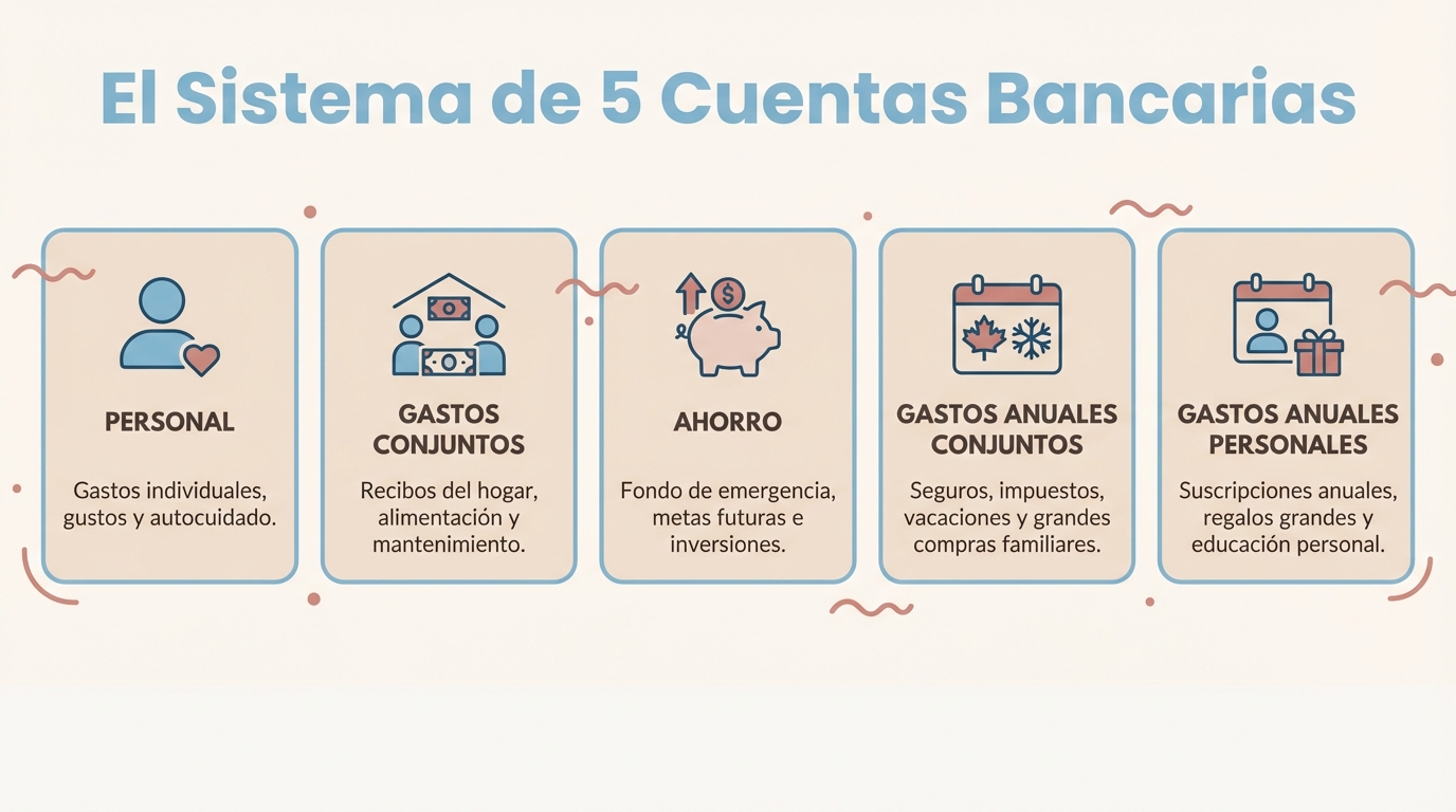 La privacidad dentro de la pareja es fundamental. Cada uno gestiona su cuenta 1 y su cuenta 5 como quiera. Las cuentas conjuntas (2, 3 y 4) son responsabilidad compartida. Es un equilibrio entre independencia y compromiso.
