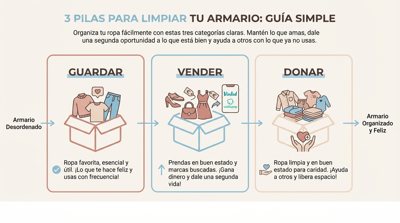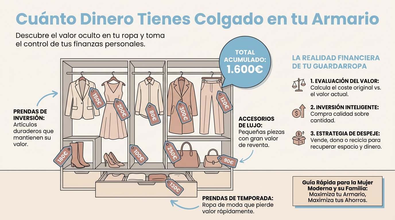 Hoy hemos visto que el armario medio español tiene casi 1.500 euros en ropa sin usar, que con el método cápsula puedes ahorrar 900 euros al año, y que con Vinted y Wallapop puedes sacar 200-500 euros de lo que ya no necesitas.