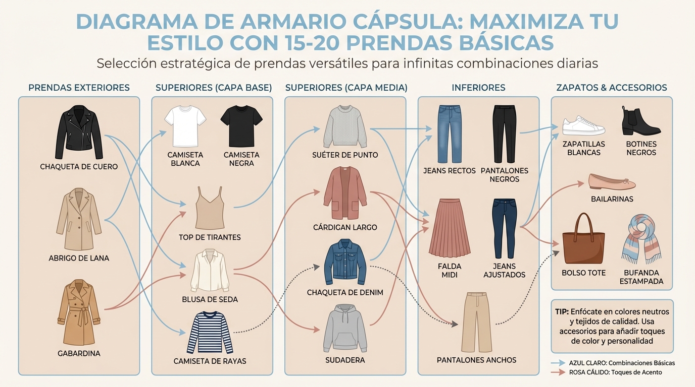 El método cápsula recomienda 30-40 prendas por temporada (sin contar ropa interior ni pijamas). Yo tengo unas 20 prendas principales y uso el 100%. Lo importante no es el número exacto, sino que uses todo lo que tienes.