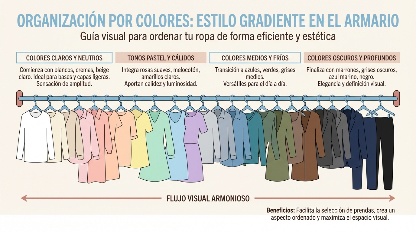 De izquierda a derecha, de claro a oscuro. Blancos y beiges a la izquierda, negros a la derecha, grises y azules en medio. Dentro de cada color, agrupa por tipo de prenda (camisetas juntas, blusas juntas). Parece simple, pero el impacto visual te ayuda a ver de un vistazo lo que tienes y lo que combina con qué.