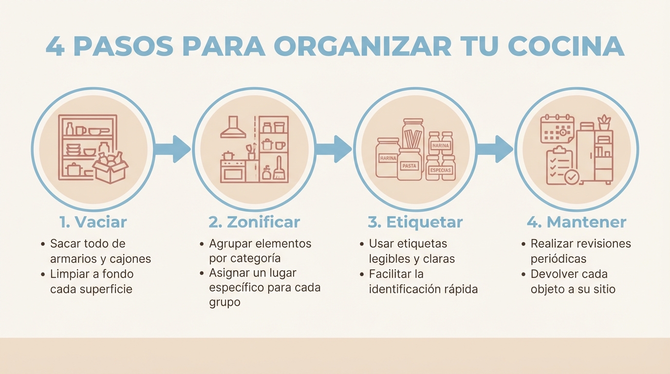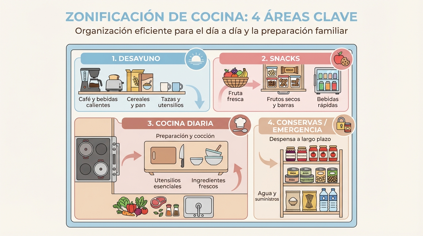 El sistema de zonas funciona en cualquier tamaño. Si tienes pocos armarios, las zonas pueden ser estantes dentro del mismo mueble en vez de armarios separados. Lo importante es que cada cosa tenga un sitio fijo. Un estante para desayuno, otro para cocina diaria, un rincón para reserva. En cocinas muy pequeñas, la zona de snacks y la de reserva pueden fusionarse. El principio es el mismo: si no está en su sitio, es que se ha acabado.