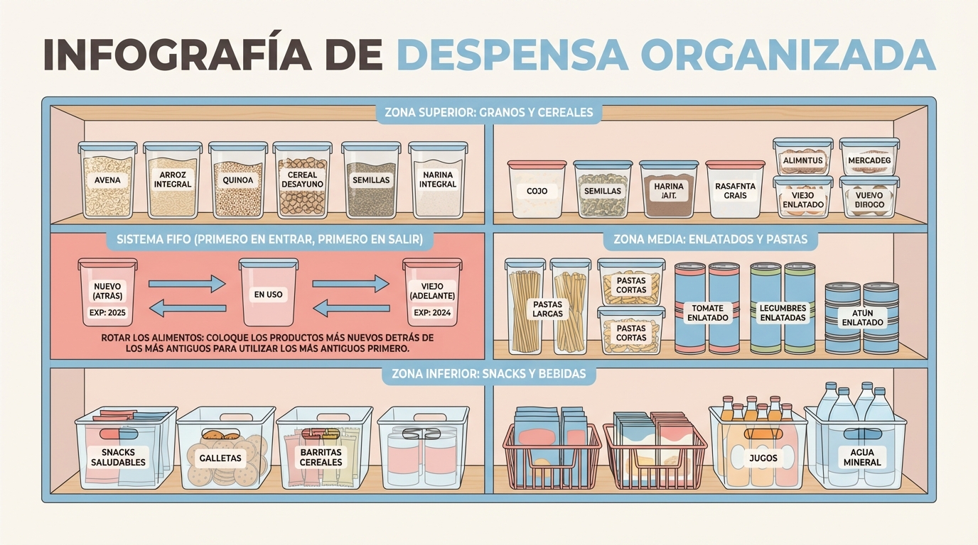 !Despensa organizada con método FIFO y contenedores etiquetados