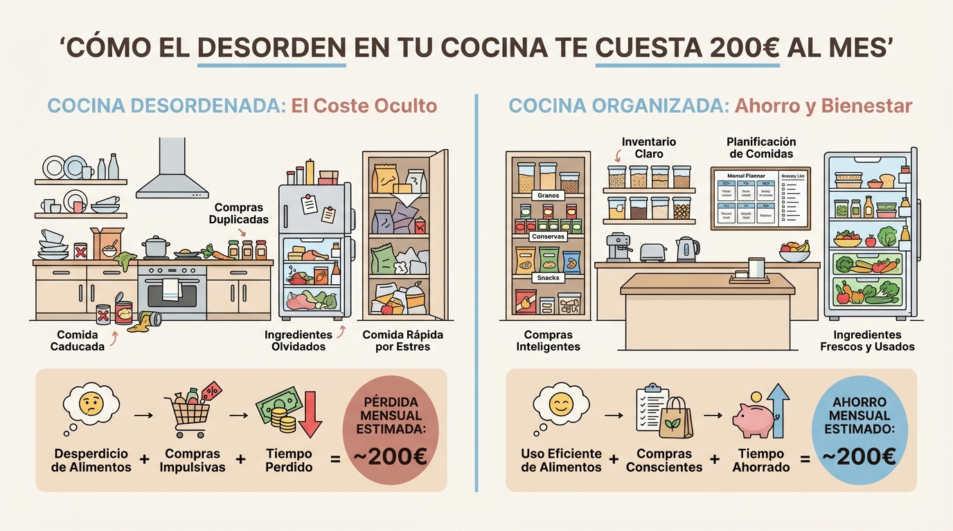 La mayoría de los consejos de ahorro se centran en el supermercado. Compara precios. Lleva lista. Mira la marca blanca. Y sí, todo eso ayuda. Pero el verdadero agujero está antes - en tu propia cocina. Si no sabes lo que tienes en casa, vas a comprar de más. Si no organizas tu despensa, vas a tirar comida. Si no planificas, vas a improvisar. Y la improvisación en la compra es carísima.