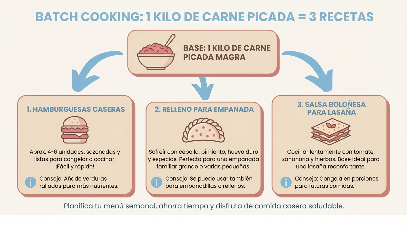 Entre un 20% y un 30% respecto a comprar sin lista ni plan. Planificar elimina las compras por impulso, reduce el desperdicio y te permite aprovechar ingredientes en varias recetas. En mi familia, un kilo de carne picada da para tres comidas de cinco personas. Todo es cuestión de pensar antes de comprar.